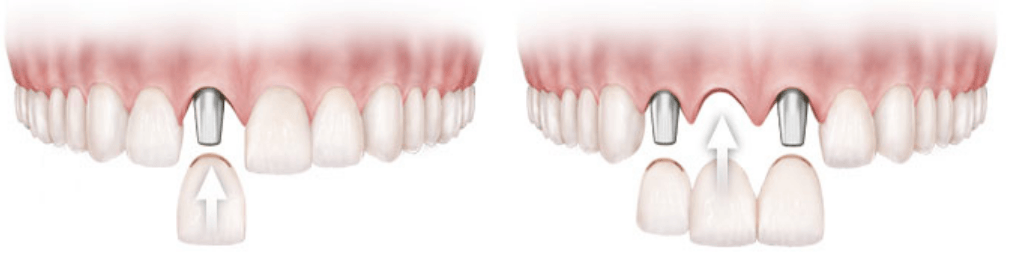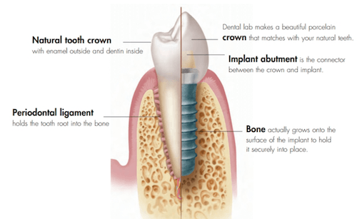 See the natural tooth on the left vs. the dental implant on the right. Implants are the most similar to natural teeth. They have a titanium root, an upper connector called an abutment, and the visible white portion called a crown.